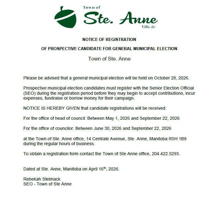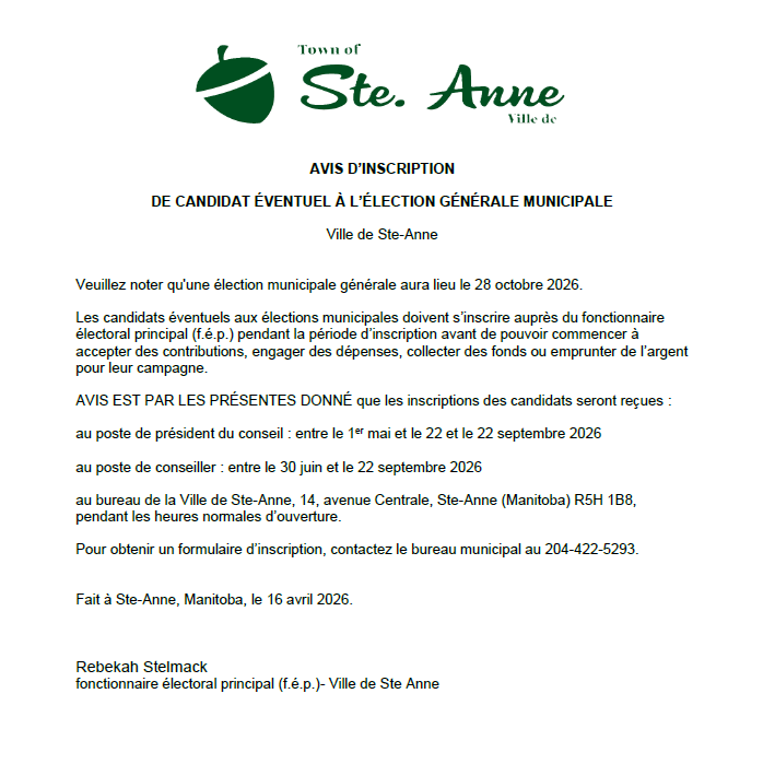 Notice of registration of prospective candidate for 2026 general municipal election/avis d'inscription de candidat éventuel à l'élection générale municipale 2026 Thursday, April 16, 2026 at 11:51 AM